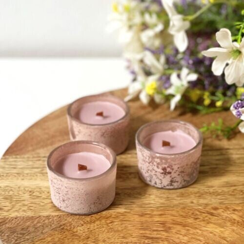 Deze geparfumeerde glazen mini kaarsjes zijn afgewerkt met een hedendaagse stone look finish.
